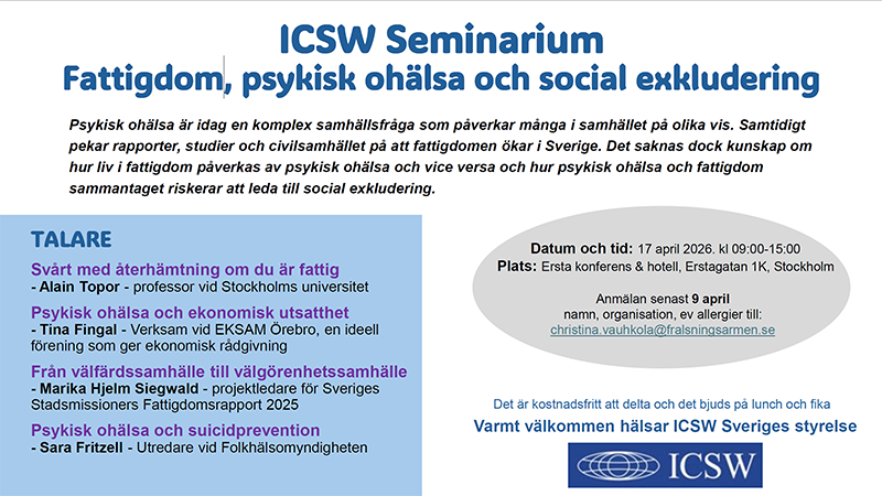 Därför ordnar ISCW Sverige seminariet Fattigdom, psykisk ohälsa och social exkludering den 17 april, kl. 9.00–15.00.